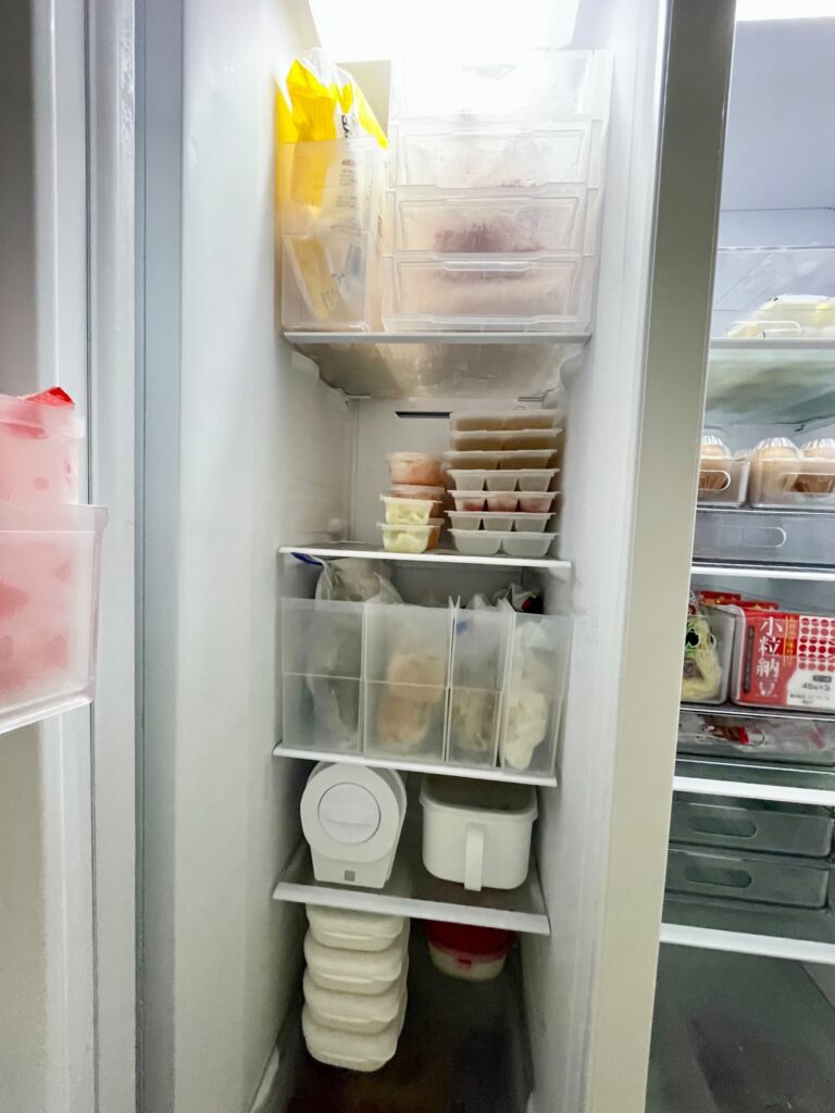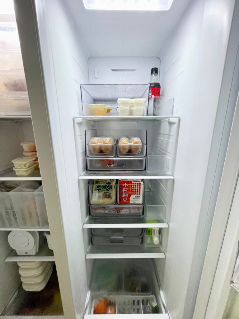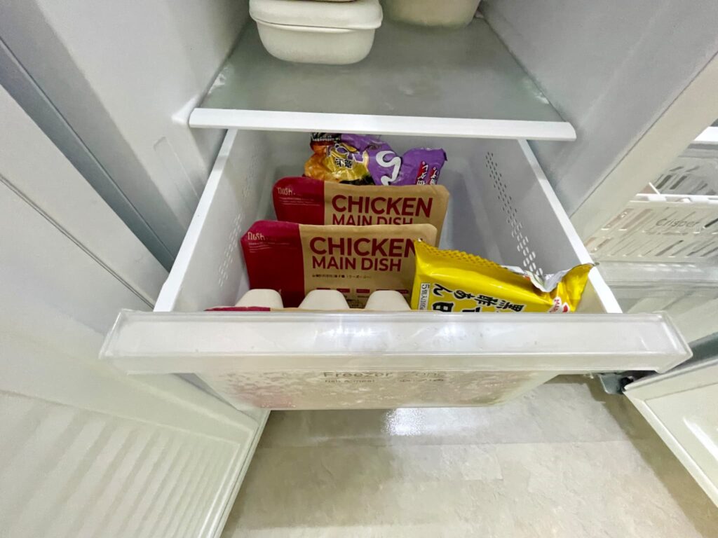 フリーケース(最下段の2段)の上段は冷凍食品のストックを収納、下段は余白。